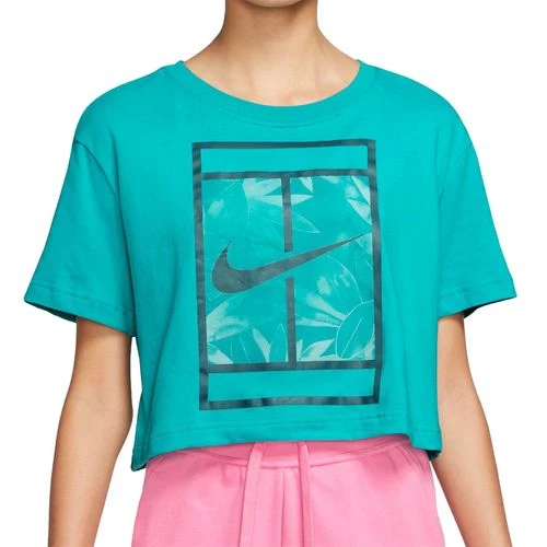 Take your game and style to new heights in the bright colors and unique prints of the Nike Women’s Fall 2023 Collection. The Nike Dri Fit Graphic Tee Shirt features a cropped fit and a full front Nike court graphic design. Made with Dri-Fit technology for optimal breathability and moisture wicking.