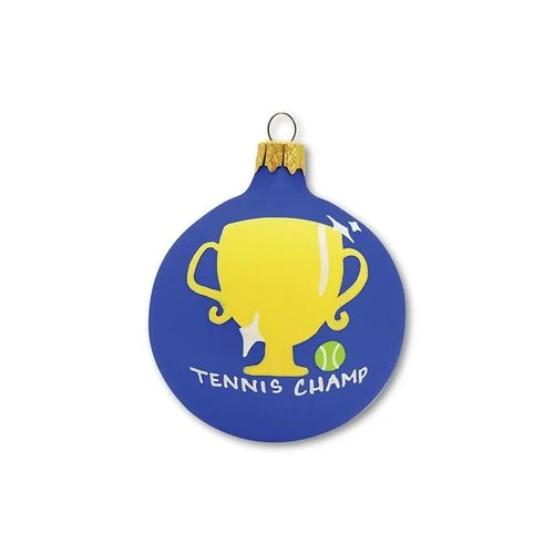 The perfect holiday gift for your favorite tennis player. The blue “TENNIS CHAMP” ornament features a bright yellow trophy in the center with a tennis ball at its side. The sides and back are plain. The hand-painted, matte glass ornament will arrive already packaged in a cute box. Ornament measures 3.25” in diameter.