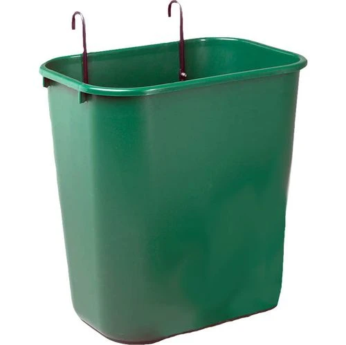 This basket is made of sturdy plastic by Rubbermaid. Hooks are attached to the basket. Basket can also be hung on the fence. Holes are drilled in the bottom of basket to allow rain water to drain out. Available in green and black.